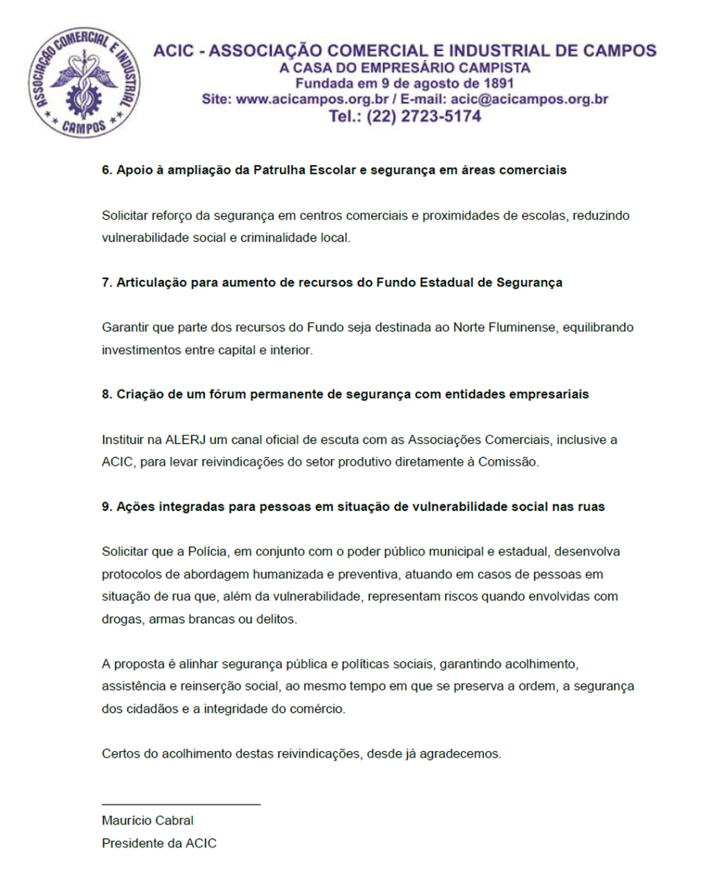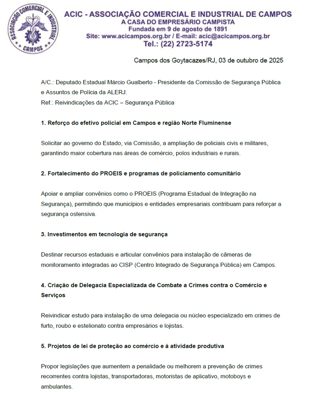m busca de um diálogo e ações efetivas que venham ajudar a reduzir os índices de violência em Campos dos Goytacazes, representantes de várias entidades de classe, entregaram na noite da última sexta-feira (3) no auditório da Associação Comercial e Industrial de Campos (ACIC) uma pauta de reivindicações ao deputado estadual Márcio Gualberto