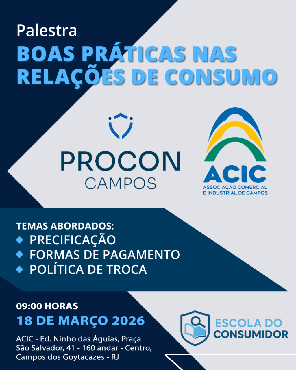 A cada dia que se passa o consumidor está mais exigente. Para atender essas demandas o presidente da Associação Comercial e Industrial de Campos (ACIC), Maurício Cabral e o diretor do PROCON Campos, Carlos Monteiro, vão oferecer uma palestra no próximo dia 18 às 9h, no auditório da instituição centenária, voltada para empresários e colaboradores.